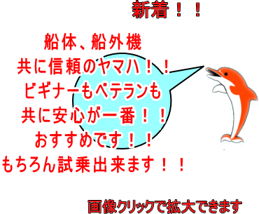 中古艇3艇のご案内を掲載しました。 ■ ヤマハ W-19FH、F9.9 セル付 ★ 308,000円(税別 28万円)★ ■ 【値下げしました】ヤマハ UF20、ヤマハ 70馬力 ★ 473,000円(税別 43万円) …